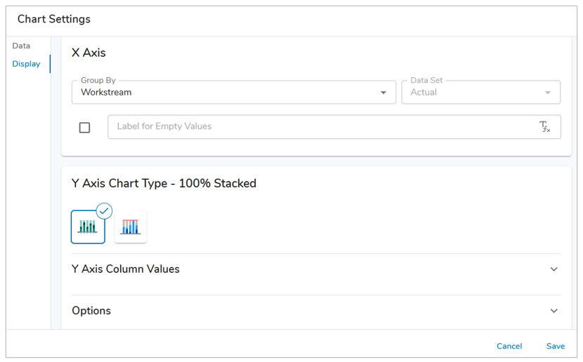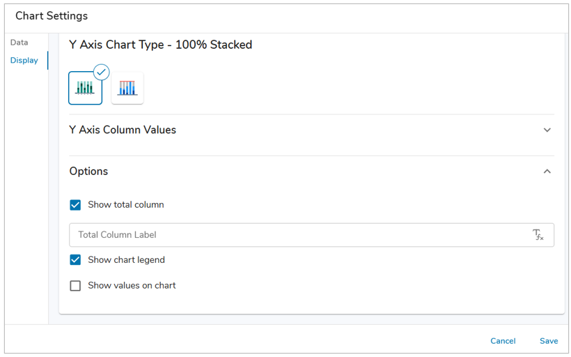 - Under the Options accordion, you can define whether the chart values or labels are displayed at all times. Additionally, a Total Column can be included on the Chart by toggling the respective checkbox with the option to modify the column label.