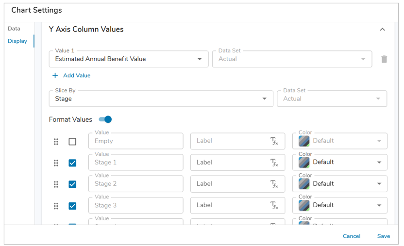 - Sliced by Pick List: Pick List options can be re-ordered by clicking and dragging on the grabber icon. Individual Pick List options can be disabled from being displayed in the Chart by de-selecting the checkbox left of the Value. Labels and colors can be modified as well.