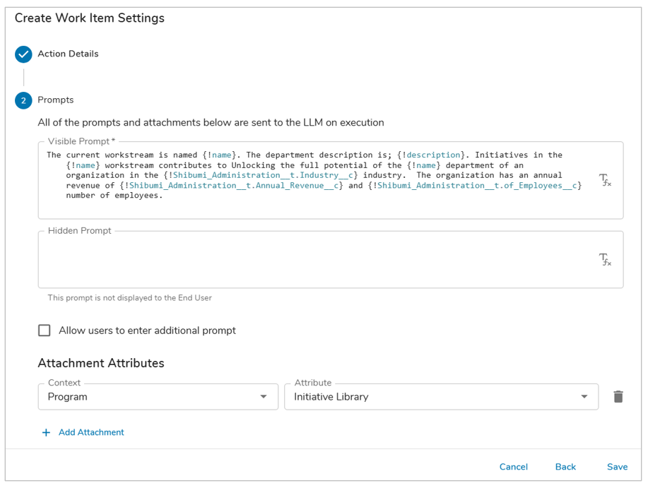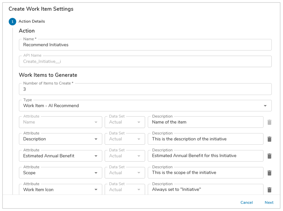 3. Next, define what values should be populated on the generated work items and the default number of items to be created. Use the ‘+ Add Attribute’ button to select the attributes whose values will be populated. Write a description for each to help Shibumi AI generate accurate and relevant suggestions on each new work item. Once the desired supporting attributes have been added, select ‘Next’.