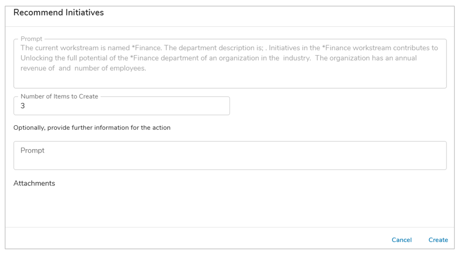 AI Recommend Content allows for the generation of one or more Work Items based on details provided by both the App Admin during configuration and the user filling out supplemental information. Each time you use AI Recommend, we’ll analyze existing work items to provide new, unique recommendations. This feature is configurable by App Admins from the AI Actions tab within the data panel on all templates.