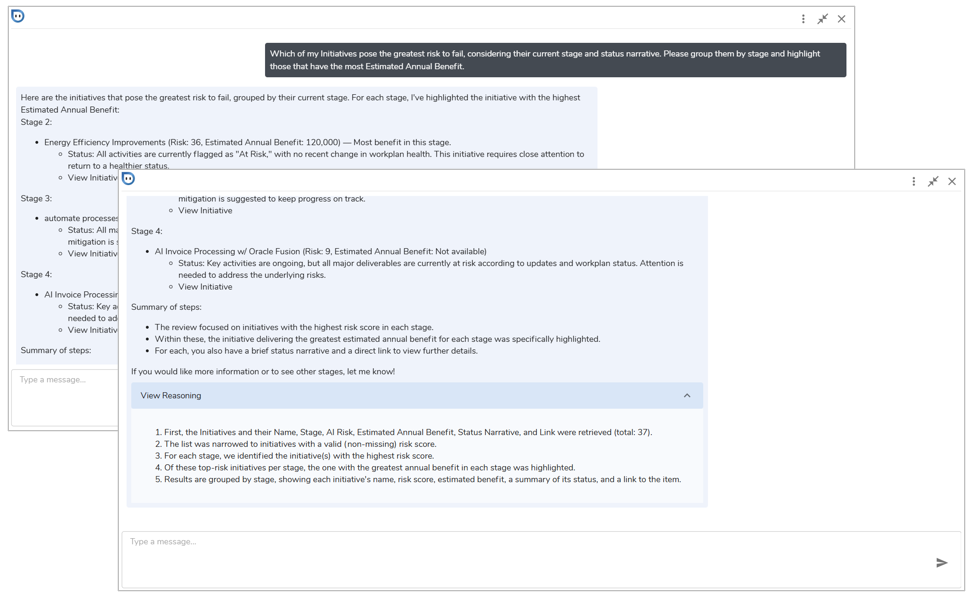 AI Analyze intelligently reviews your program to help you progress initiatives/opportunities, get ahead of risks, and make prioritization decisions. The chatbot responds to natural language prompts by assessing your specified work item’s value, risk, dependencies, timelines, etc.