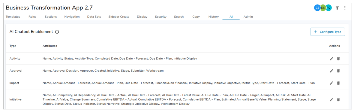 To edit a previously configured template for AI Analyze, click the edit icon (pencil) for an existing template to add or remove attributes.