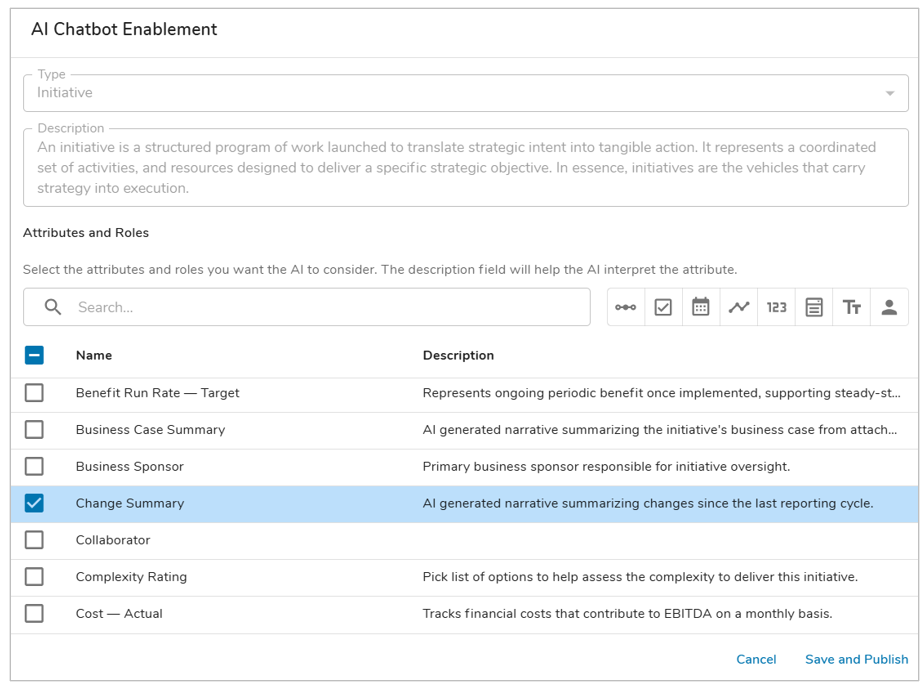 - Use the checkbox to the left of the attribute name to enable an attribute (association, checkbox, date, metric, pick list, text, or role). The chosen attribute’s definition will be automatically included. Optionally, use the selector on the right to filter available attributes by their type. Follow the same process to add more attributes if desired.