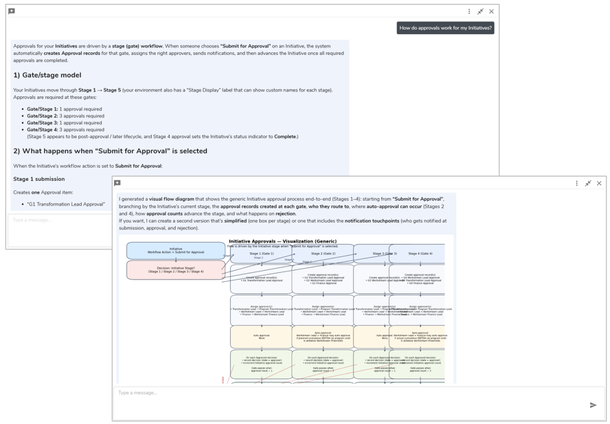 AI Analyze intelligently reviews your program to help you progress initiatives or opportunities, get ahead of risks, and make prioritization decisions. The chatbot responds to natural language prompts by assessing your relevant program data.