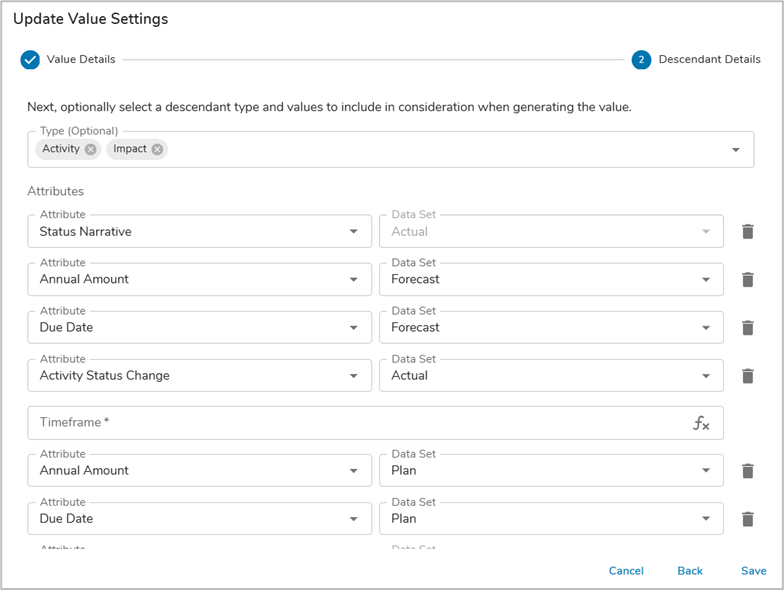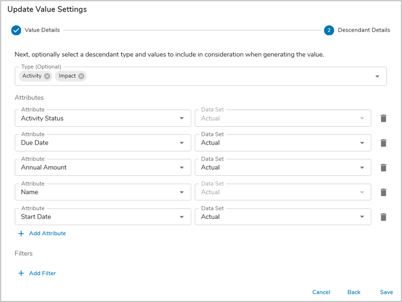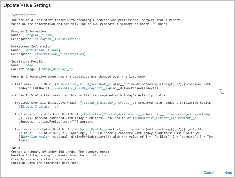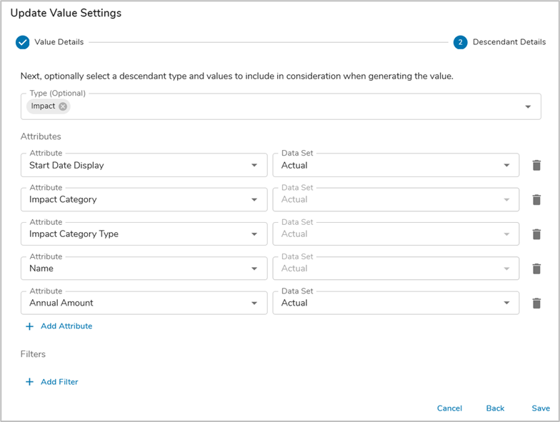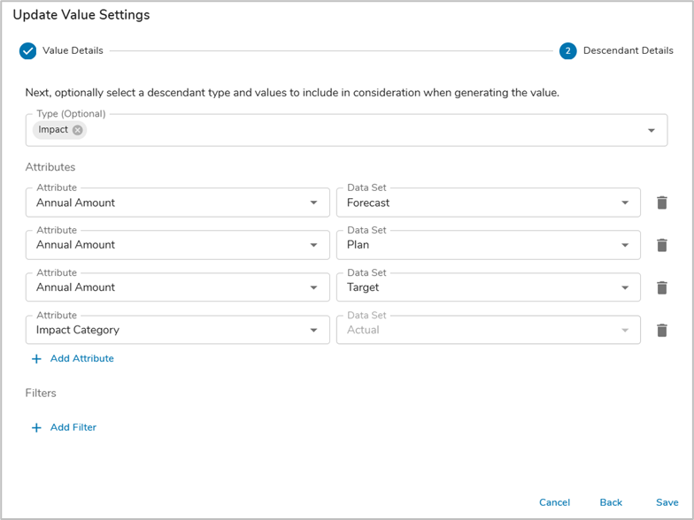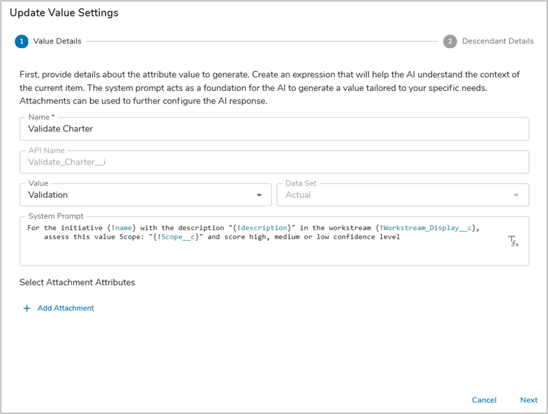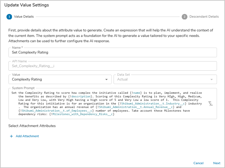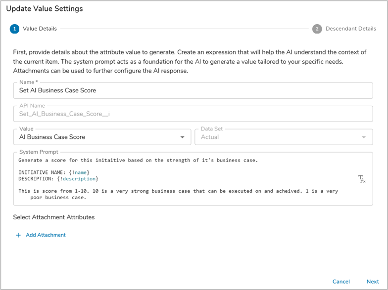 - With a solid prompt defined, the next step is to pull in descendant attribute values to assist the AI Action in formulating a response. Since we are at the Initiative level in a solution, we will pull in values from descendent Impacts so that any changes in the Forecasted, Planned or Target Annual Amount can be assessed properly.