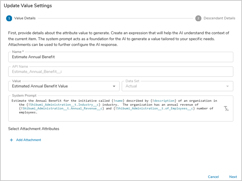 - Define a Name for the AI Action (in our example: Estimate Annual Benefit), then select the desired attribute to be updated (in our example: Estimated Annual Benefit Value), and lastly enter a System prompt. In our example we are ensuing that the prompt provides adequate context, background information, and structure, length, and formatting guidance for the AI-produced outcome.