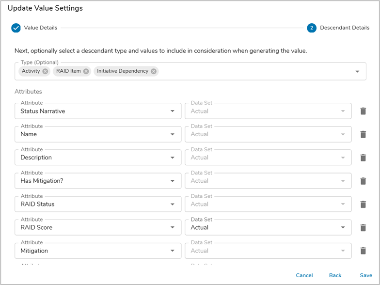 - With a solid prompt defined, the next step is to pull in descendant attribute values to assist the AI Action in formulating a response. Since we are at the Initiative level in a solution, we will pull in values from descendent Activities and Impacts so that any changes in status, due date, or value can be properly assessed for inclusion in the status summary.