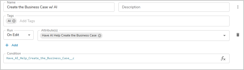 - Condition: the ‘Have AI Help Create the Business Case’ checkbox is checked (i.e., true)