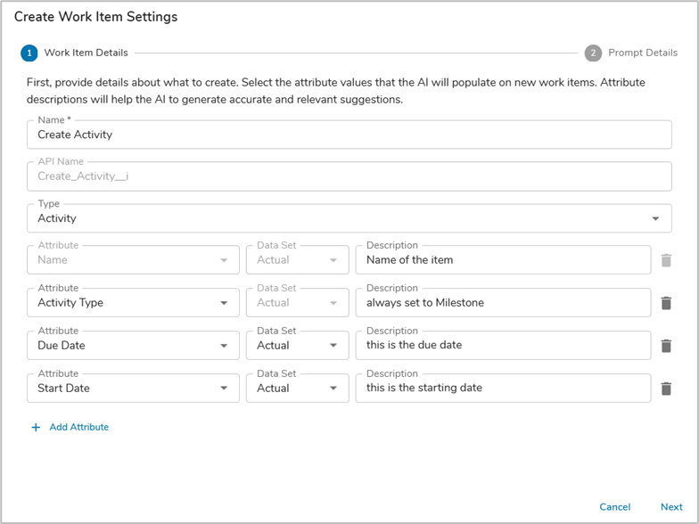 - Define a Name for the AI Action (in our example: Create Activity), then select the desired work item type to be created (in our example: Activity) and lastly define additional attributes to be included with values upon creation of the work item. After providing a description for each of the included attributes, select ‘Next’.