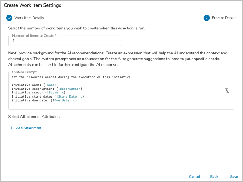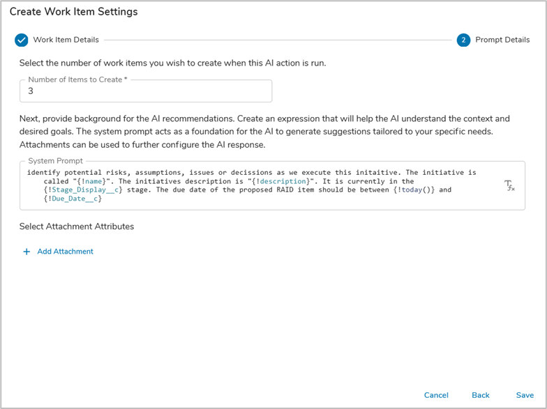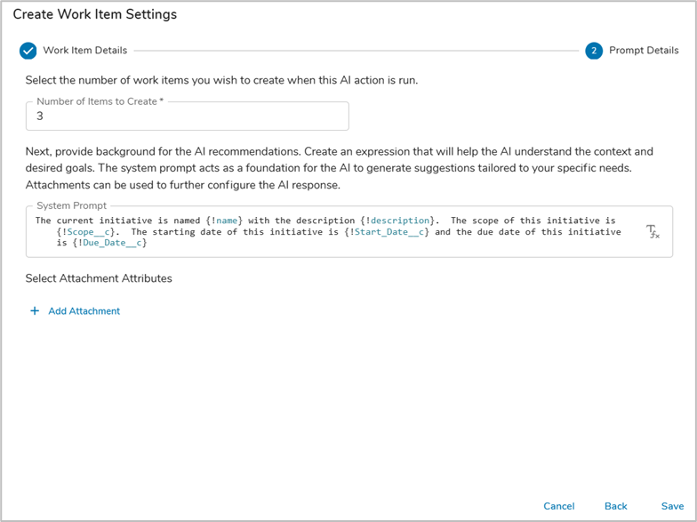 - Finally, define the default number of items to create and enter a System Prompt. In our example we are ensuring that the prompt provides adequate expectations for output and the context for what data should be pulled from the analyzed Business Case document. With the System Prompt configured, select ‘Save’.