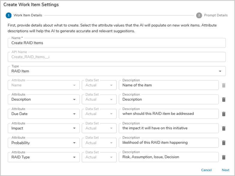 - Define a Name for the AI Action (in our example: Create RAID Items), then select the desired work item type to be created (in our example: RAID Item) and lastly define additional attributes to be included with values upon creation of the work item. After providing a description for each of the included attributes, select ‘Next’.