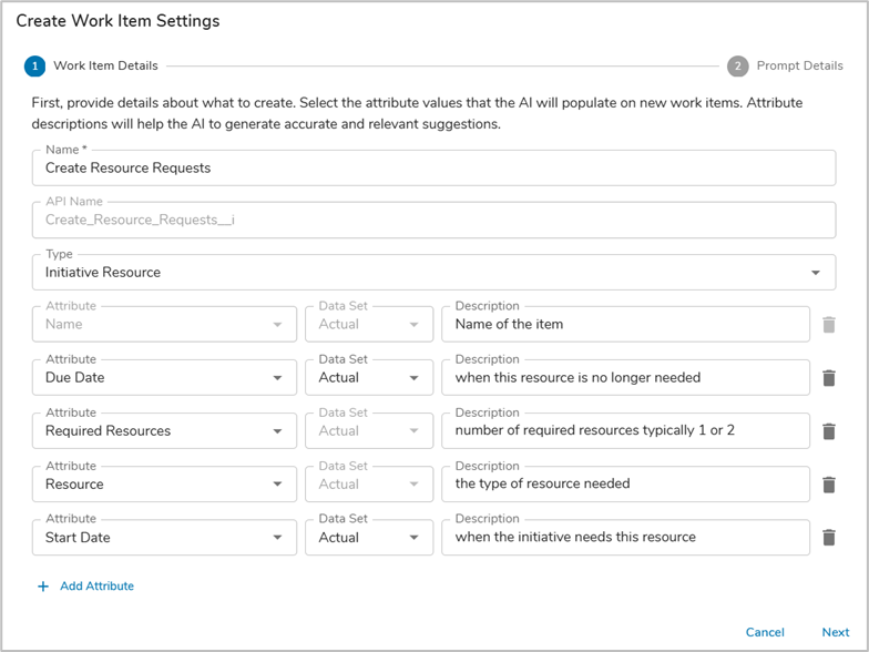 - Define a Name for the AI Action (in our example: Create Resource Requests), then select the desired work item type to be created (in our example: Initiative Resource) and lastly define additional attributes to be included with values upon creation of the work item. After providing a description for each of the included attributes, select ‘Next’.