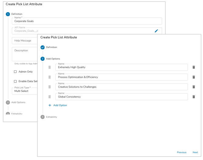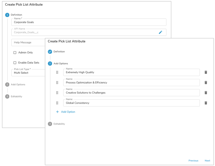 - Enter a Name for the pick list attribute (Shibumi will automatically define the API Name using the Name you’ve entered).