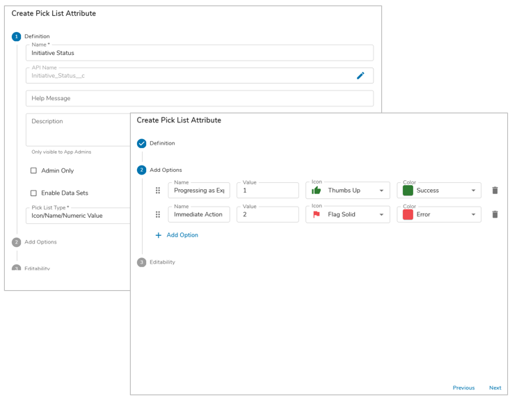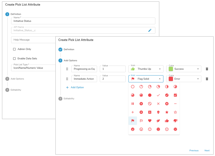 Icon Name Value pick lists allow the user to select only one option. Each named option in the pick list has a corresponding value (which can be either text or numeric) as well as a corresponding icon (the configuration of which includes a color selection). Shibumi displays the named option and the icon and additionally stores the value option for use in expressions and calculations.