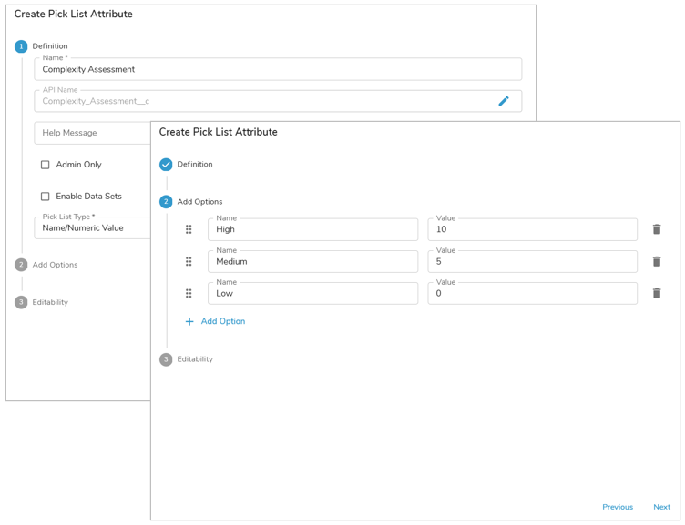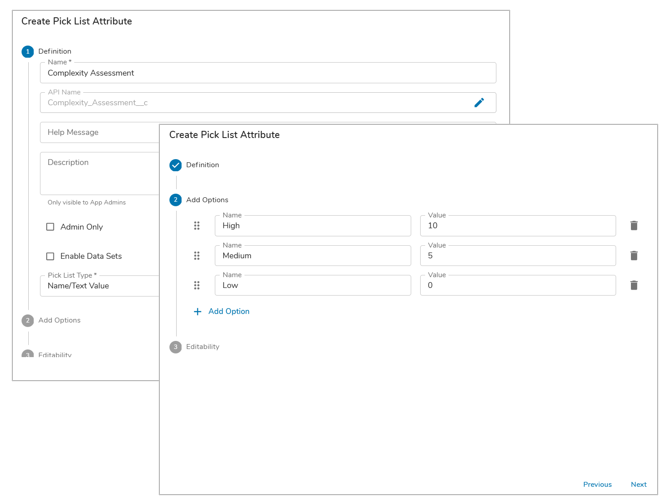 One example use case for a Name Value pick list is a Complexity Assessment that factors into an RPA Opportunity prioritization. Typically, this Complexity Assessment pick list would be one of several contributing to an overall prioritization score. E.g., selecting “High” in the Complexity Assessment pick list provides a numeric value of “10” to the prioritization score calculation.