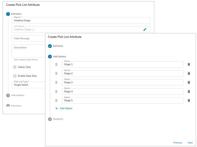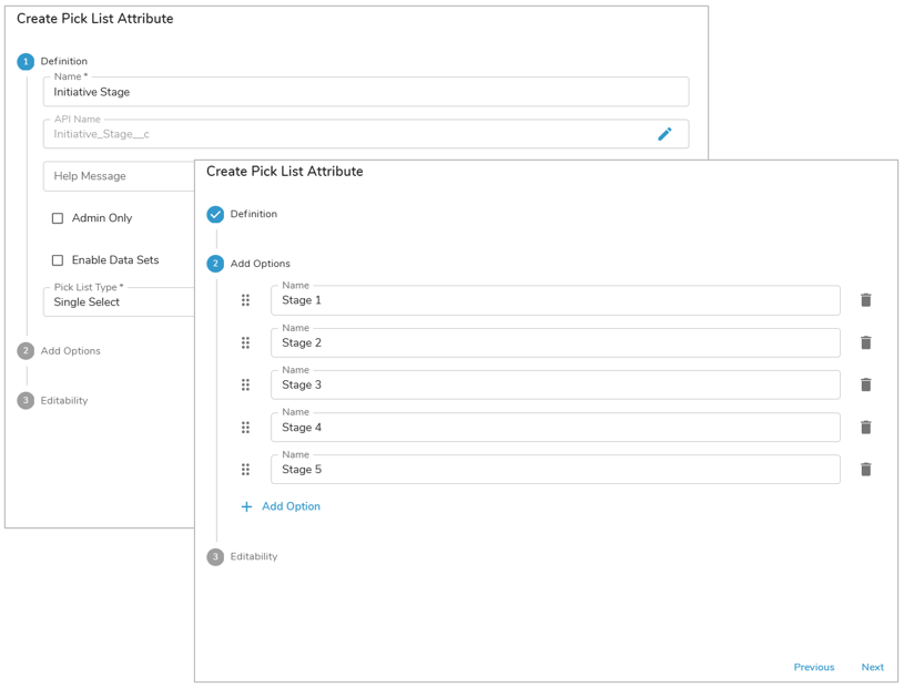 Single Select pick lists allow the user to select only one option from the pick list. The displayed value and stored value match for this type of pick list. One example use case for a Single Select pick list is the Initiative Stage (i.e., the initiative can only be in one stage at a time).