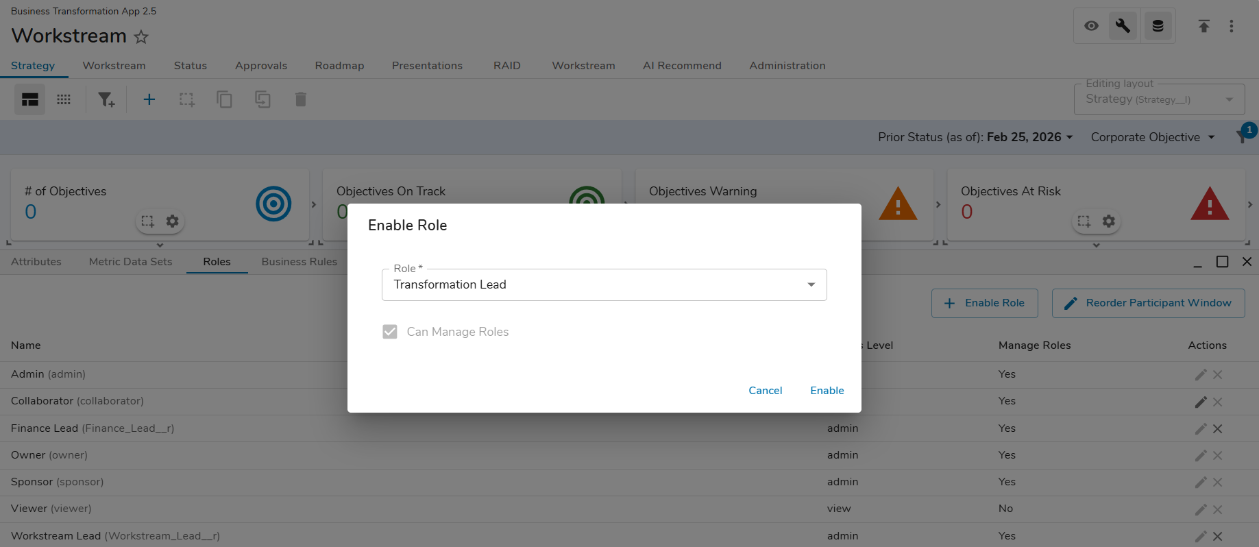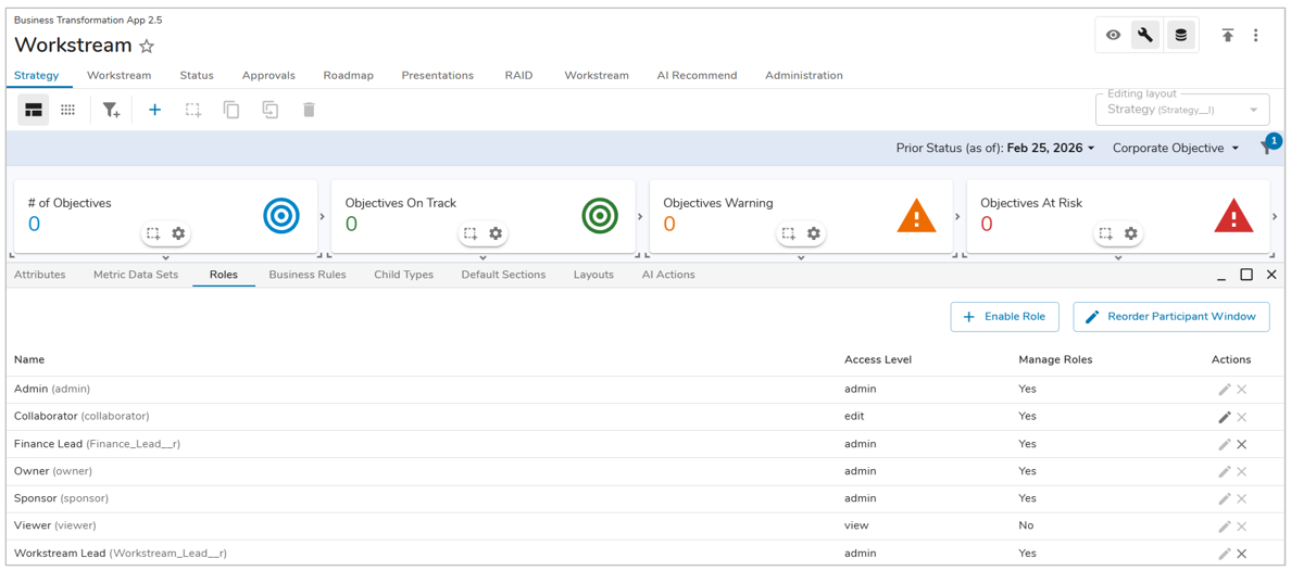 - The original Shibumi roles (Admin, Owner, Sponsor, Collaborator, Viewer) are enabled by default and cannot be disabled.