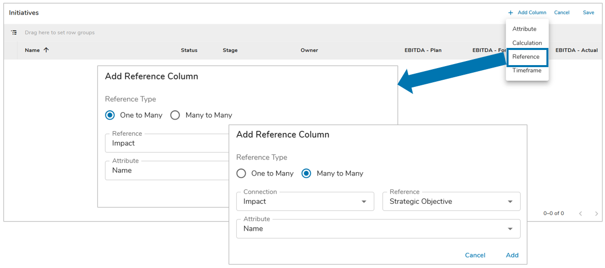 - Click on the + Add Column button on the top right of the section, choose the Reference option.