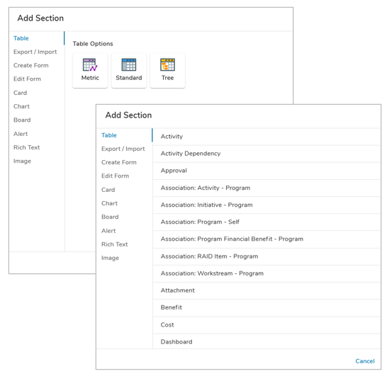 The Table section is an extremely performant display of work items (i.e., instances of a template) or associations. Tables can be configured to include editing of data or creation of new work items.