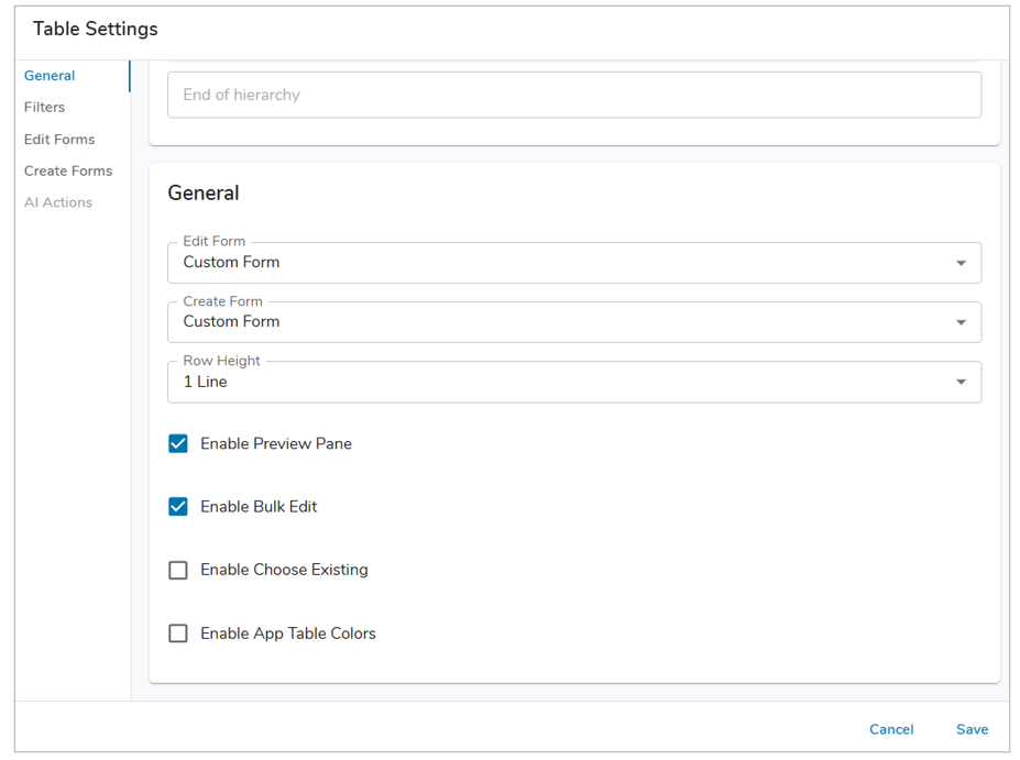 Note: The AI Actions tab will only be active if an action has been configured for the template type selected for the Table.