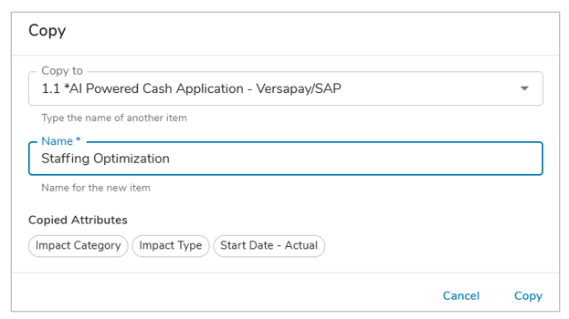 Copying work items in Shibumi supports efficient program management when multiple similar work items are required. App Admins configure which templates allow work items to be copied and define which attribute values are included during the copy process.