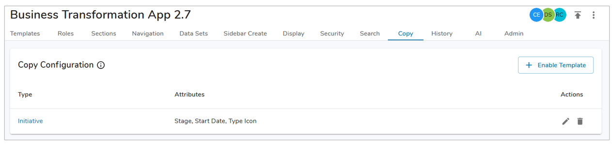 - To Edit or Delete an existing Template Copy configuration, select the edit (pencil) or delete (trash) icon, respectively.