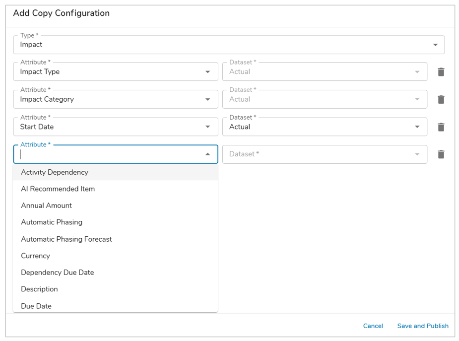 - In the Type drop down of the Add Copy Configuration dialog, select a Template and define which Attributes to include along with their respective Data Sets (if applicable).