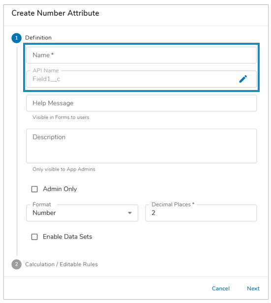 - For each attribute type, you must define a Name which will then retroactively define the API Name for the attribute. (Optionally) edit the API Name as needed.