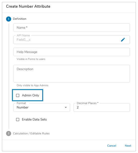 - For each attribute type, you can define the attribute’s inclusion in dashboard/presentation configurations by checking the ‘Admin Only‘ checkbox. In doing so, only App Admins can see the attribute within Add Field / Add Column / section configuration dialogs.