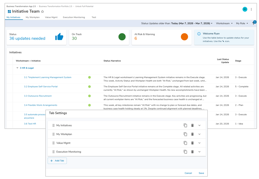 - Context: the context which was selected for the Dashboard and where it pulls the information from (Initiative, Workstream, etc.).