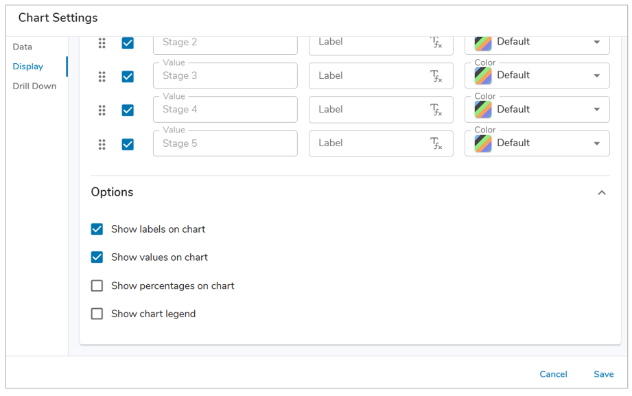 - Under the Options accordion, you can define whether the chart slice’s values, percentages, or labels are displayed.