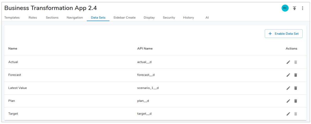 On the Data Sets tab of the App Detail Page, App Admins can enable data sets. Actual and Target will be enabled by default and cannot be disabled.