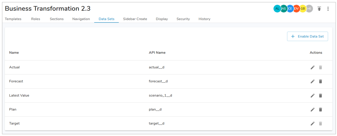On the Data Sets tab of the App Detail Page, App Admins can enable data sets. Actual and Target will be enabled by default and cannot be disabled.