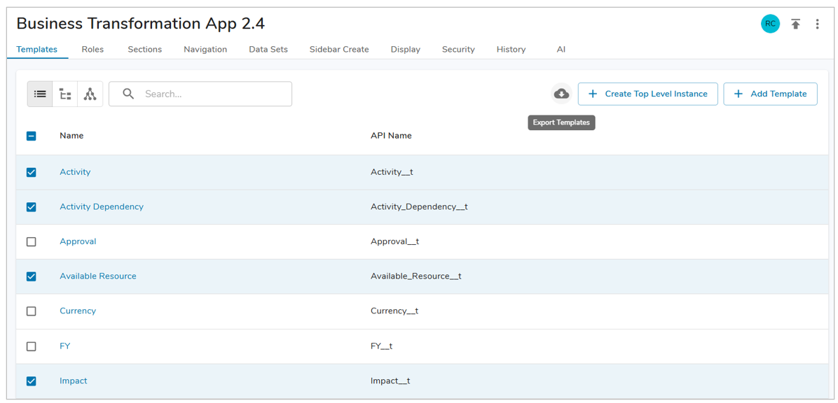 - Select the export icon at the top of the template list next to the search field. A confirmation dialog will appear showing all the templates that will be exported. All checked templates will show as Selected Templates. Any additional templates in the hierarchy will show as Additional Templates and will also be exported.