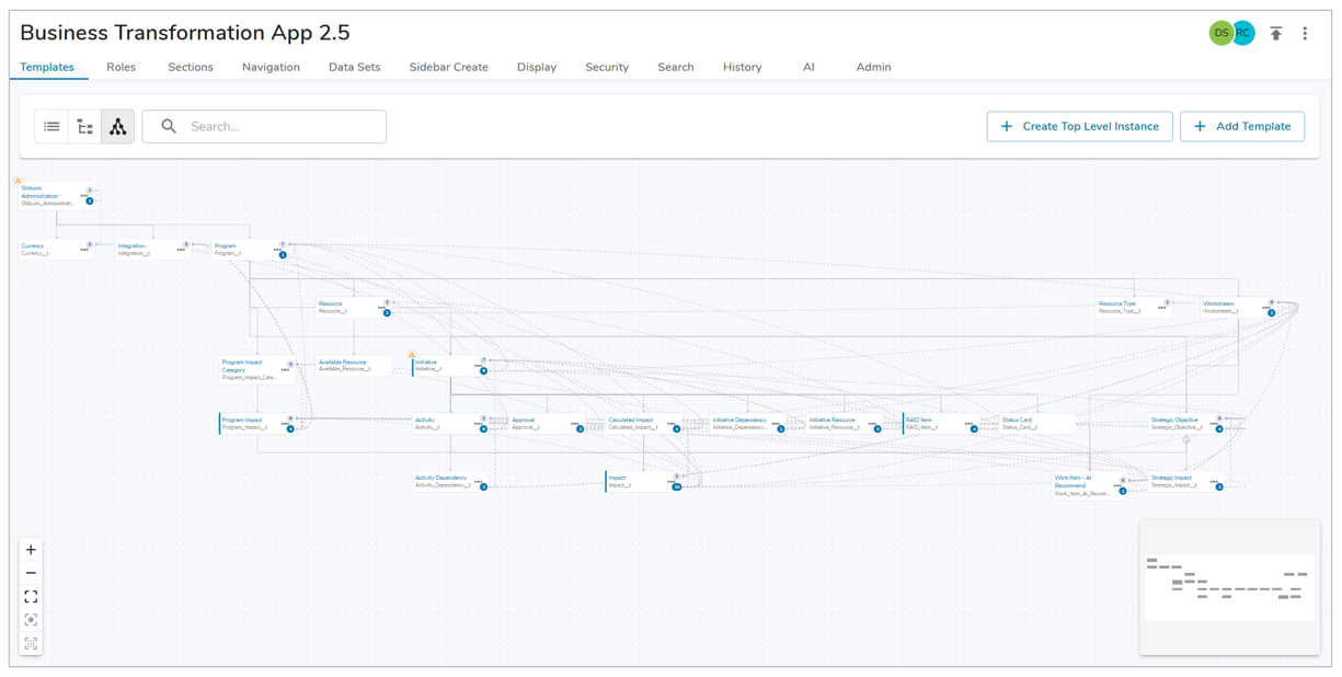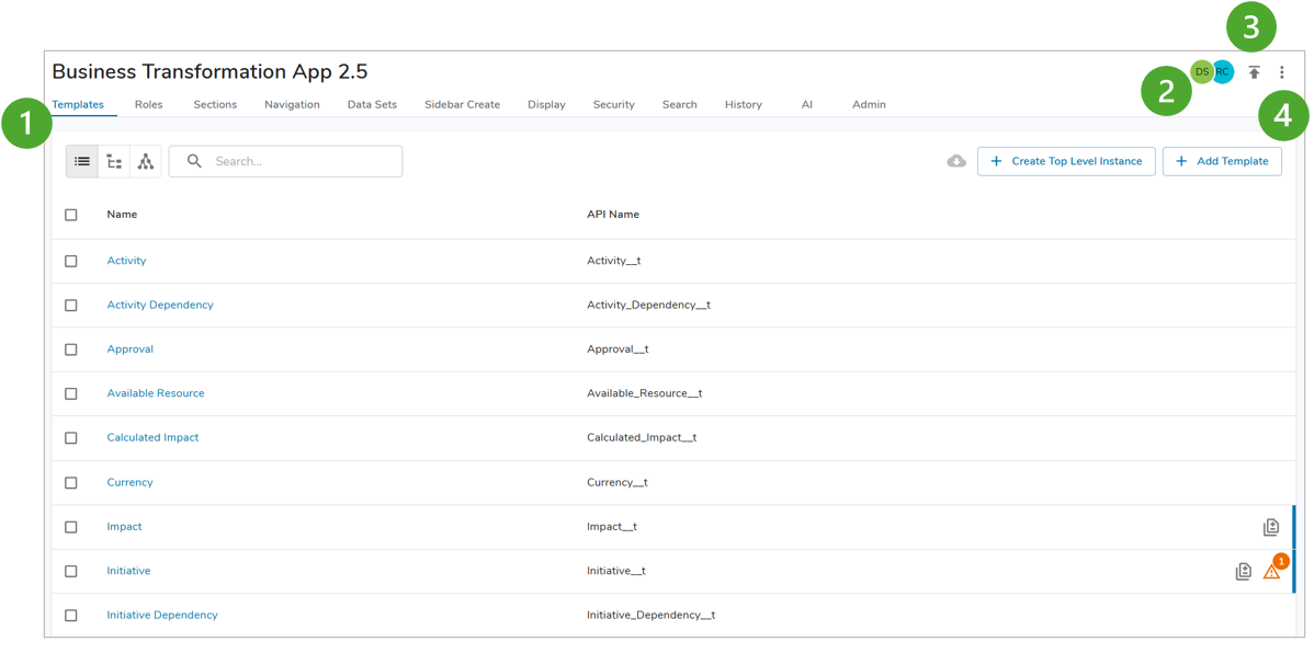 - Templates, Roles, Sections, Navigation, Data Sets, Sidebar Create, Display, Security, and History Tabs: Access template, role, section, navigation tree, data set, display, and sidebar create configuration via the tabs under the app name. On the Template tab, you can add new templates, create new top level instances, and access or export existing templates. Templates are building blocks that define the hierarchy and structure of a solution and enable the collection and review of data. Learn all about customizing templates here.