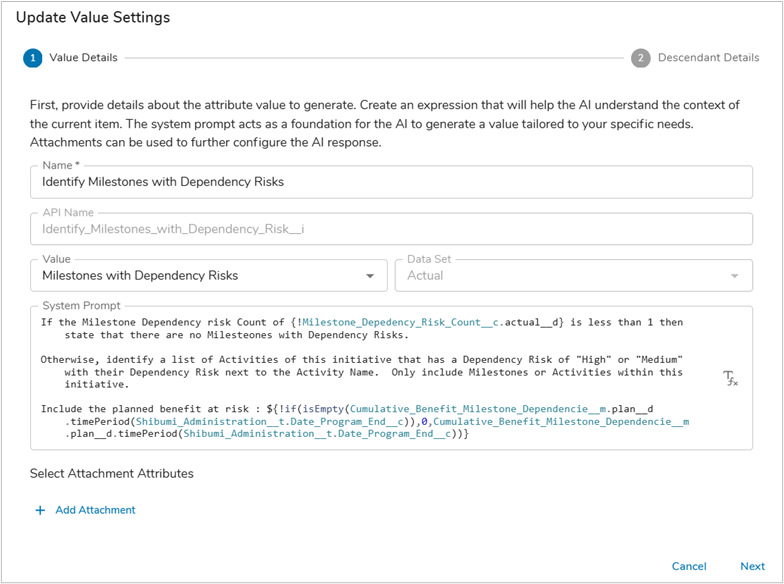 - Define a Name for the AI Action (in our example: Identify Milestones with Dependency Risks), then select the desired attribute to be updated (in our example: Milestones with Dependency Risks), lastly enter a System Prompt. In our example we are ensuring that the prompt provides adequate context, background information, and specific timing for the benefit value.