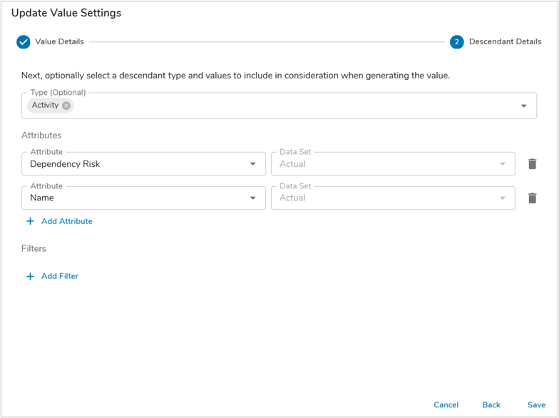 - With a solid prompt defined, the next step is to pull in descendent attribute values to assist the AI Action in formulating a response. Since we are at the Initiative level in a solution, we will pull in values from descendent Activities, specifically whether they are dependent on another work item.