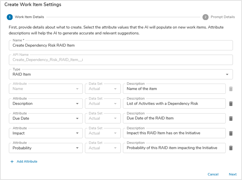 - Define a Name for the AI Action (in our example: Create Dependency Risk RAID Item), then select the Type of work item to be created (in our example: RAID Item), lastly define any supporting attributes and their descriptions which should have their values populated on create, select Next.