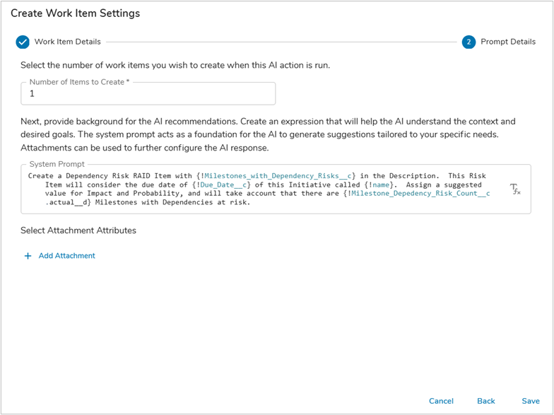 - Define the default number of work items to create with the AI Action. Enter in a System Prompt, in our example we are ensuring that the prompt provides the identified dependency risks from the previous AI Action, background information, and the attributes to highlight upon work item creation.