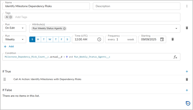 - Condition: Check that the count of Milestone Dependency Risks is more than 0, and that the Run Weekly Status Agents is ‘true’.