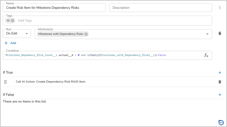 - When there are identified milestone dependency risks and the ‘Milestones with Dependency Risks’ text attribute is edited and contains a value, the Business Rule should initiate the AI Actions. Click the plus sign in the If True section and select the AI Action option. Add the Create Dependency Risk RAID Item AI Action.