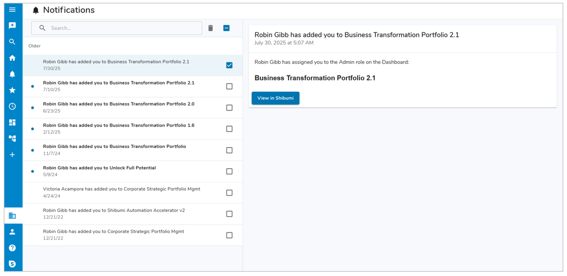 Access the Notifications list by clicking on the notifications icon (bell) in the Navigation Sidebar. When you have unread notifications, a red number with the count of new notifications will appear over the icon.