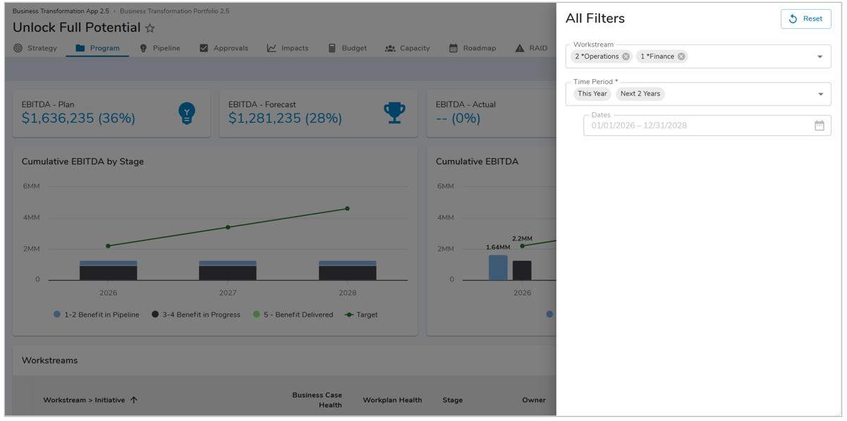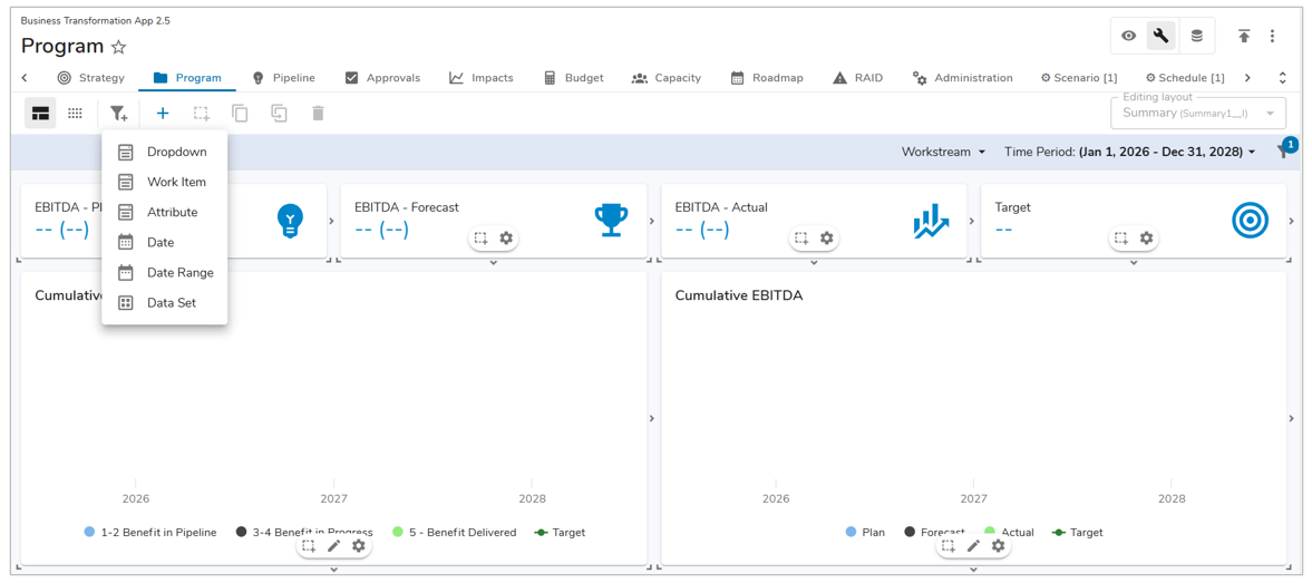 Sections can be configured so their data responds to values selected in page filters. For Dropdown, Work Item, Date and Date Range filters, reference the filter API name(s) using the dynamic filter syntax, {!toFilter(API_Name__f)} in section filters. When using a data set filter, it will be available for selection when defining values to display in most sections.