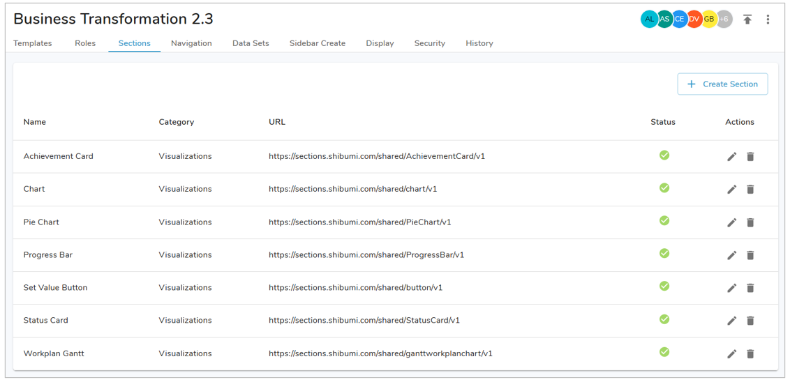 The status of sections will be displayed in the table. The status is green when the section is functioning normally. A red status means that something is wrong with the section itself and will need attention from the section developer.