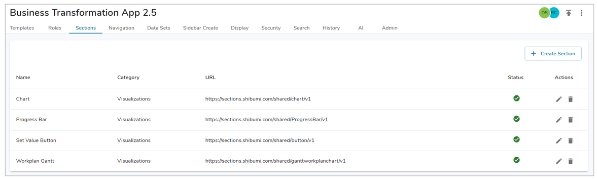 The status of sections will be displayed in the table. The status is green when the section is functioning normally. A red status means that something is wrong with the section itself and will need attention from the section developer.