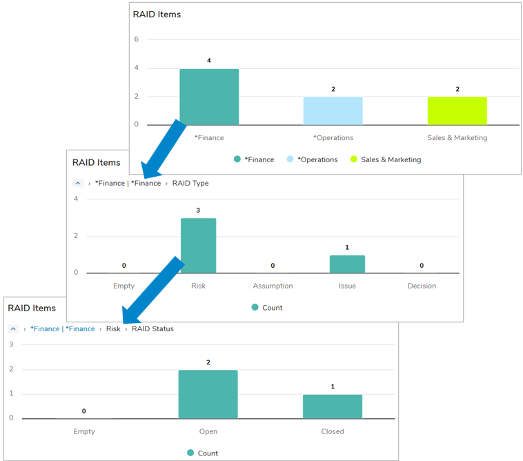 Once groupings have been configured for a Column/Stacked Column Chart, selecting a slice will update the Chart to display the work items within the slice grouped by the defined attribute.