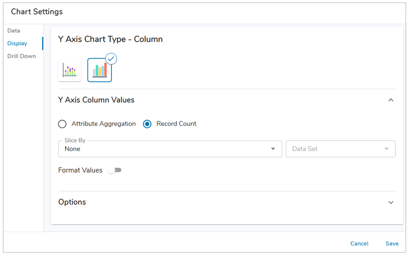 - Determine the Y Axis Column Values in the Chart by selecting either Attribute Aggregation or Record Count. Add as many Values as desired by selecting the ‘+ Add Value’ option.