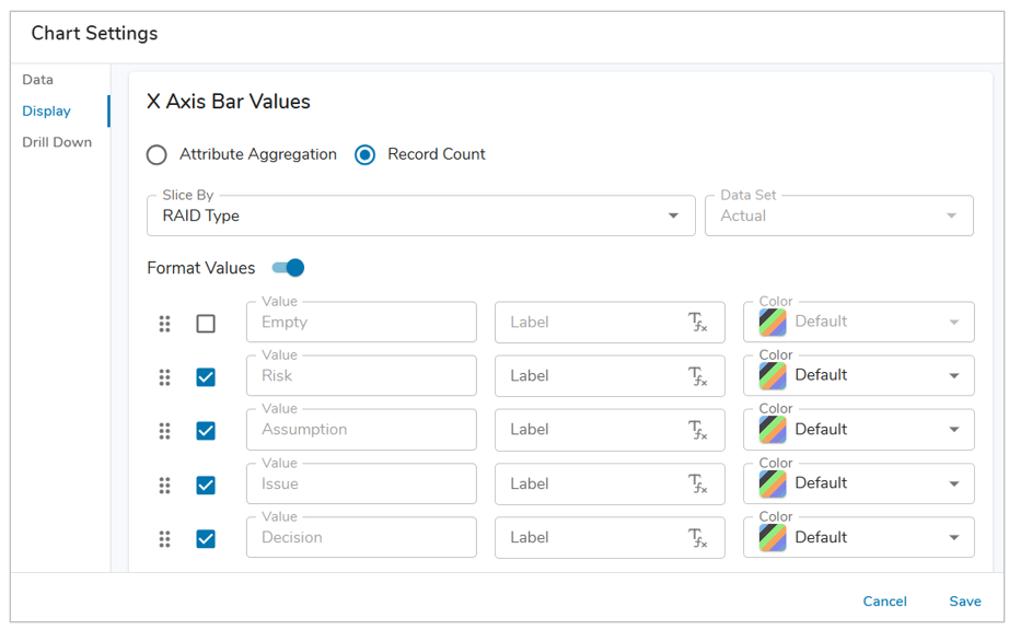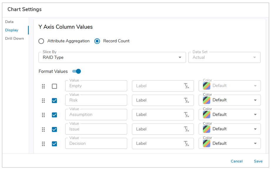 - Sliced by Pick List: Pick List options can be re-ordered by clicking and dragging on the grabber icon. Individual Pick List options can be disabled from being displayed in the Chart by de-selecting the checkbox left of the Value. Labels and colors can be modified as well.