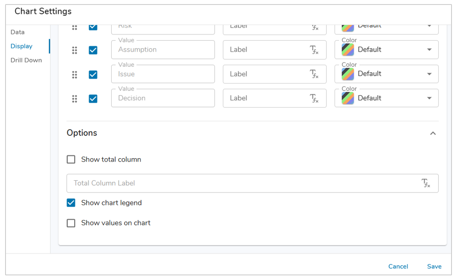 - Under the Options accordion, you can define whether the chart values, total column, or labels are displayed at all times.